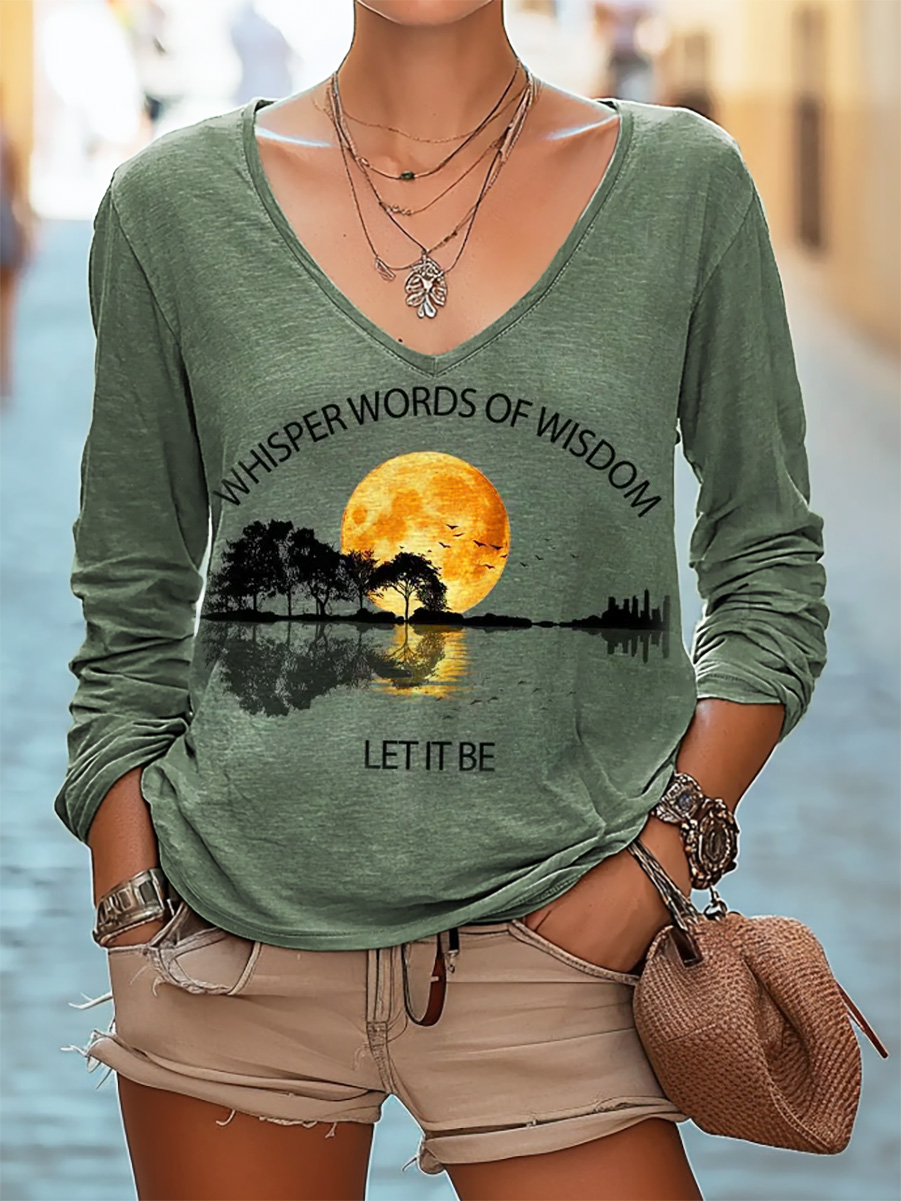 Women's Vintage Art Print Casual V-neck Long Sleeve T-shirt