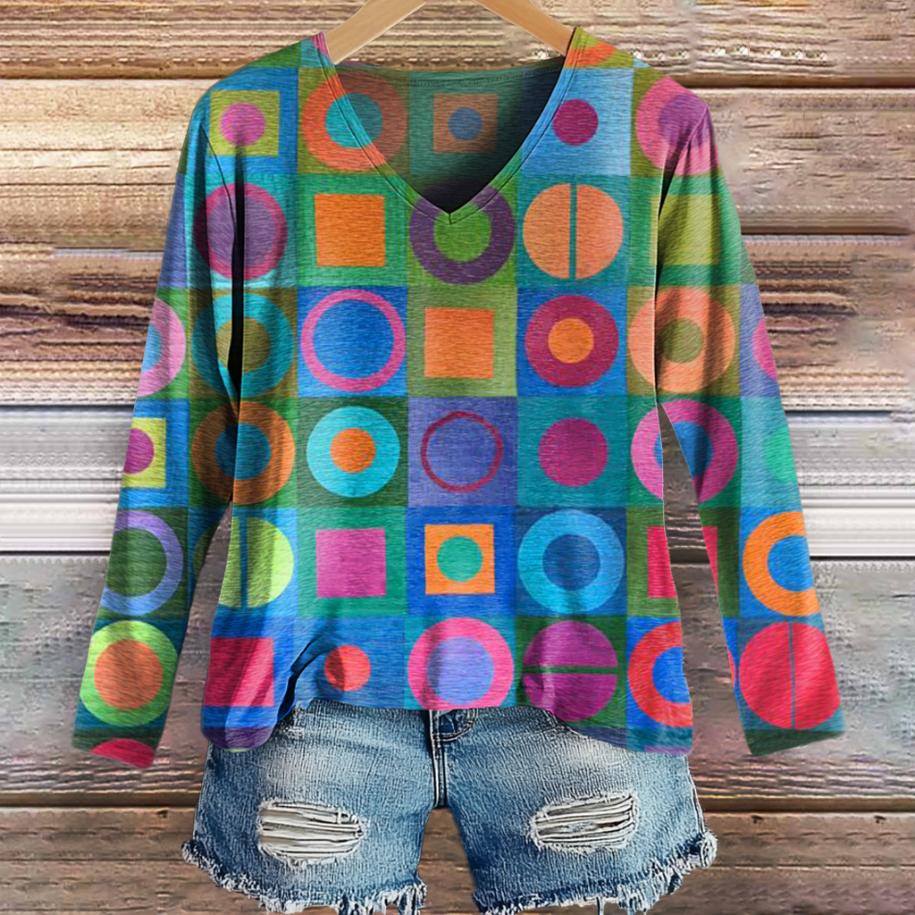 Women's Colorful Collage Art Print Casual V-neck Long Sleeve T-shirt