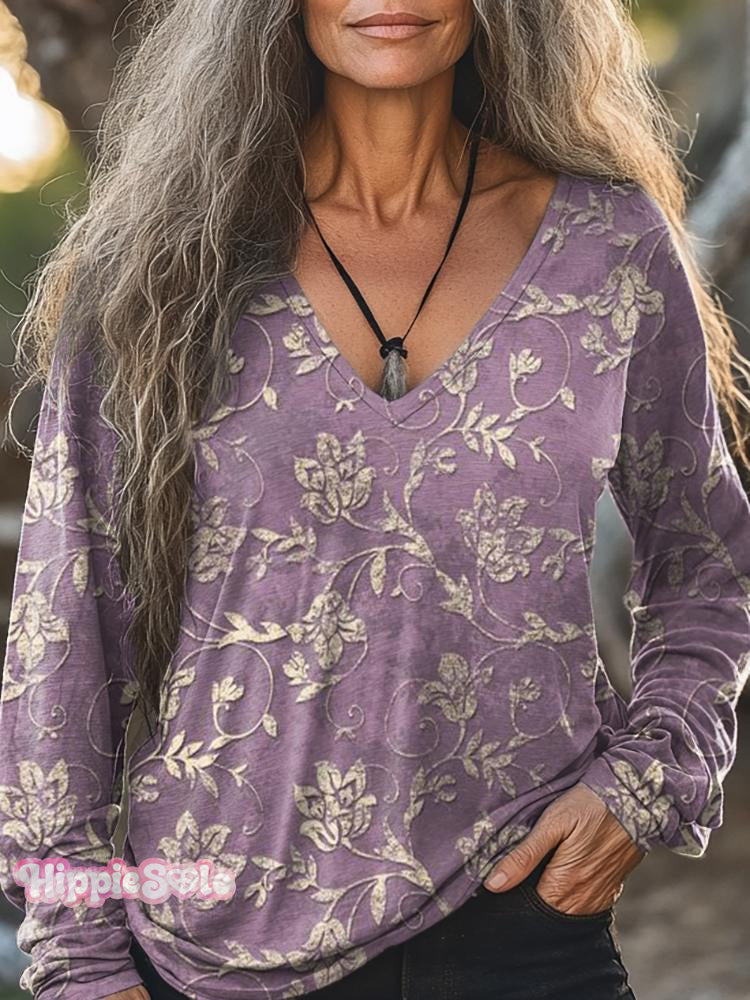 Women's Vintage Bohemian Flowers Pattern Collage Print Casual V-neck Long Sleeve T-shirt
