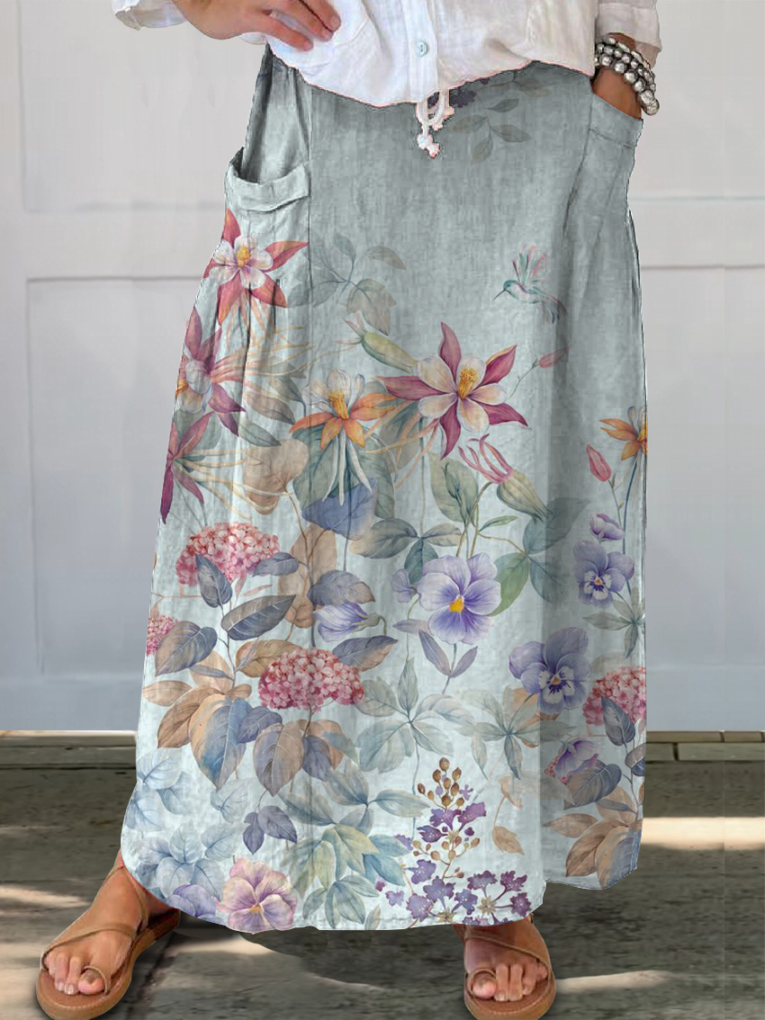Women's Muted Floral Art Printed Linen Pocket Skirt