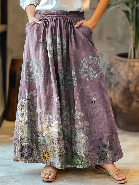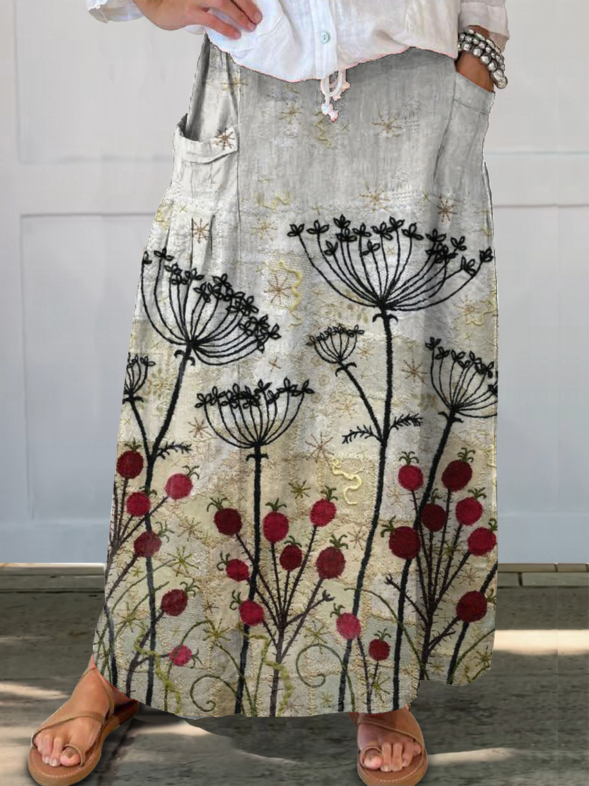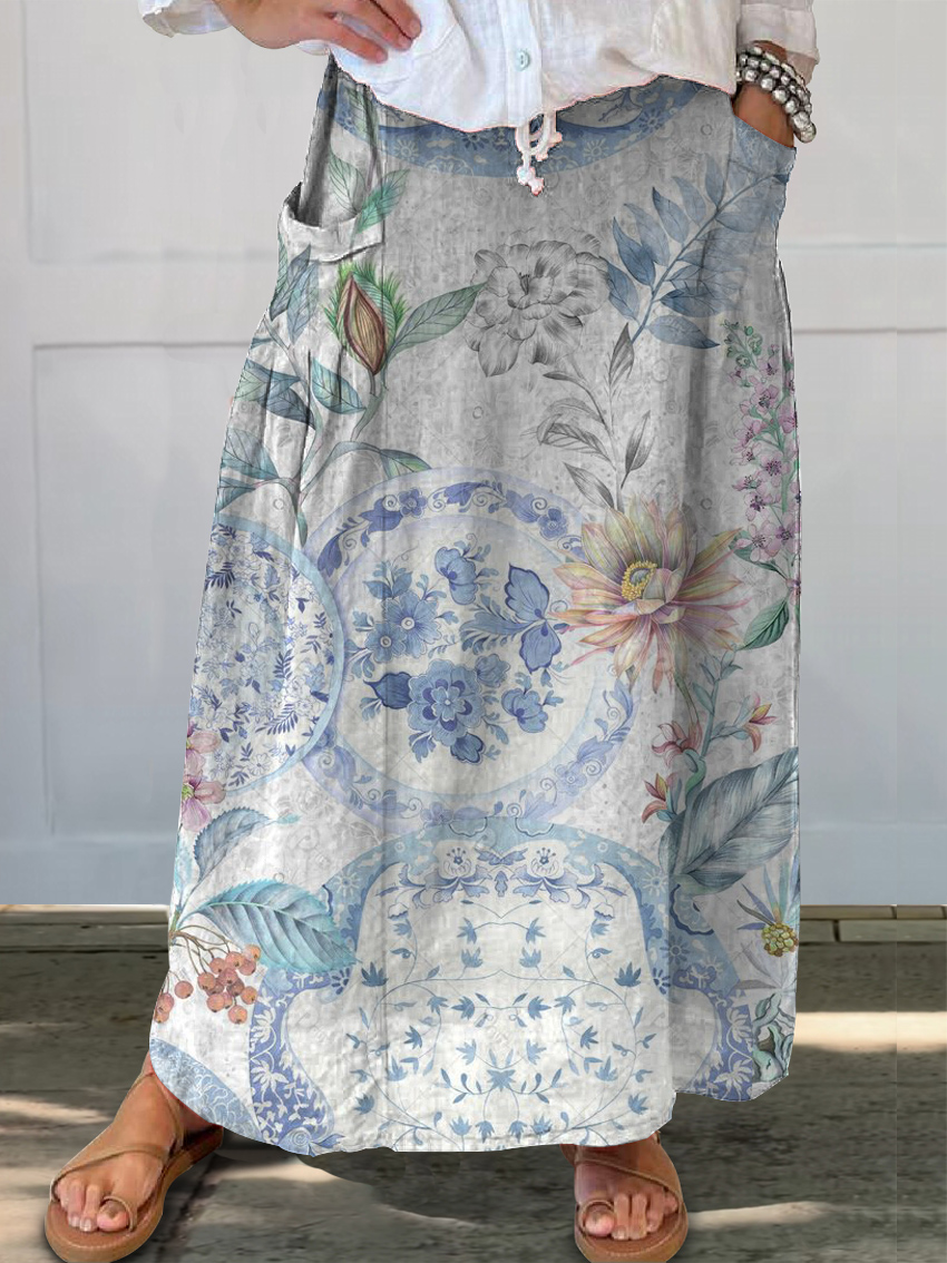 Women's Folk Flower Art Patterns Print Linen Pocket Skirt