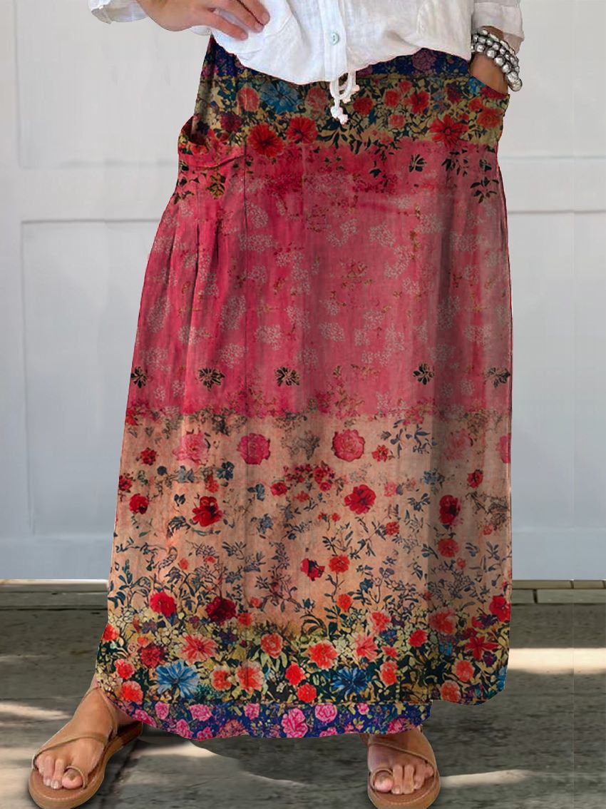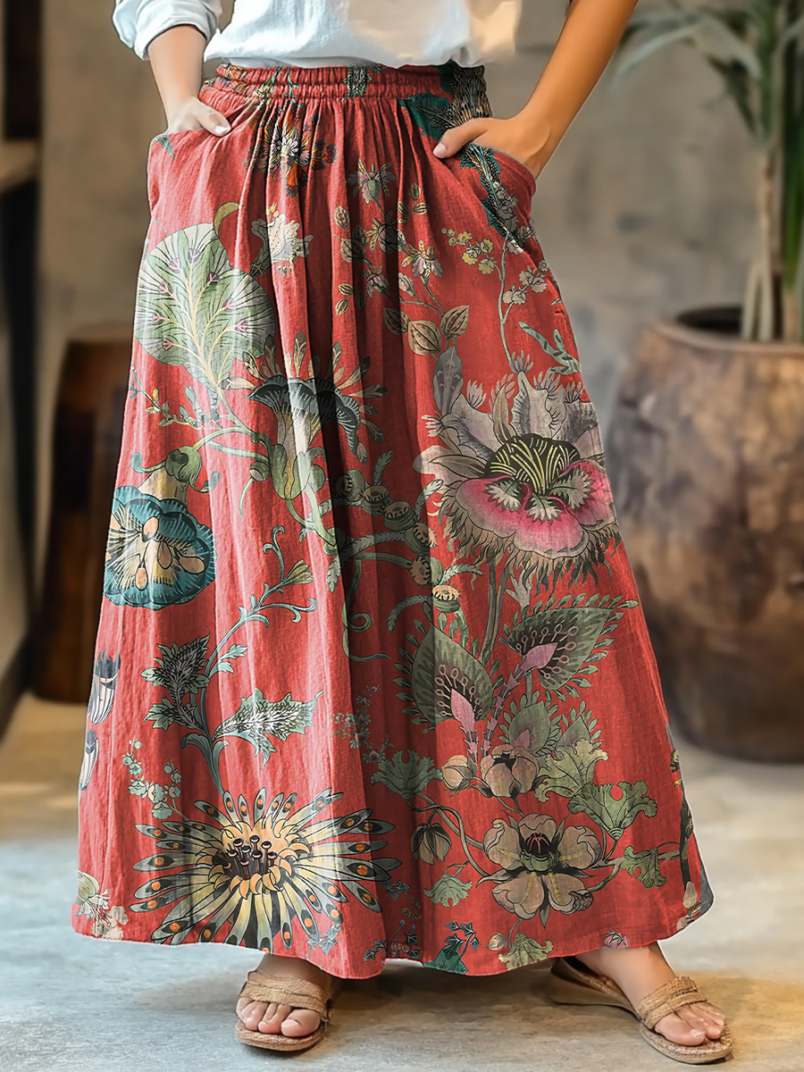 Women's Colorful Retro Floral Art Linen Pocket Skirt