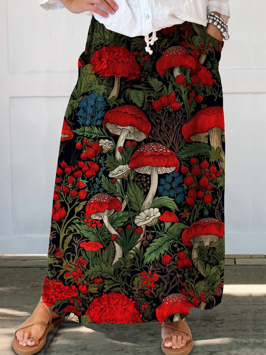 Women's Retro Mushroom Print Linen Pocket Skirt