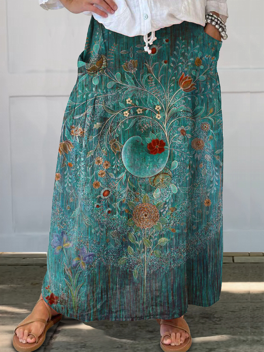 Women's Vintage Floral Art Print Linen Pocket Skirt