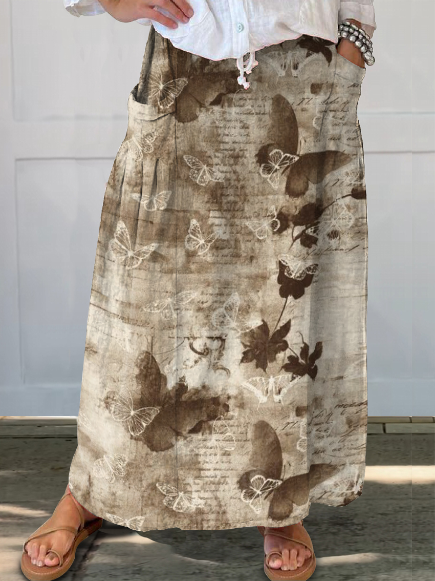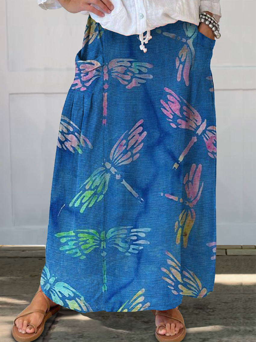 Women's Gradient Tie-Dye Dragonfly Art Print Linen Pocket Skirt