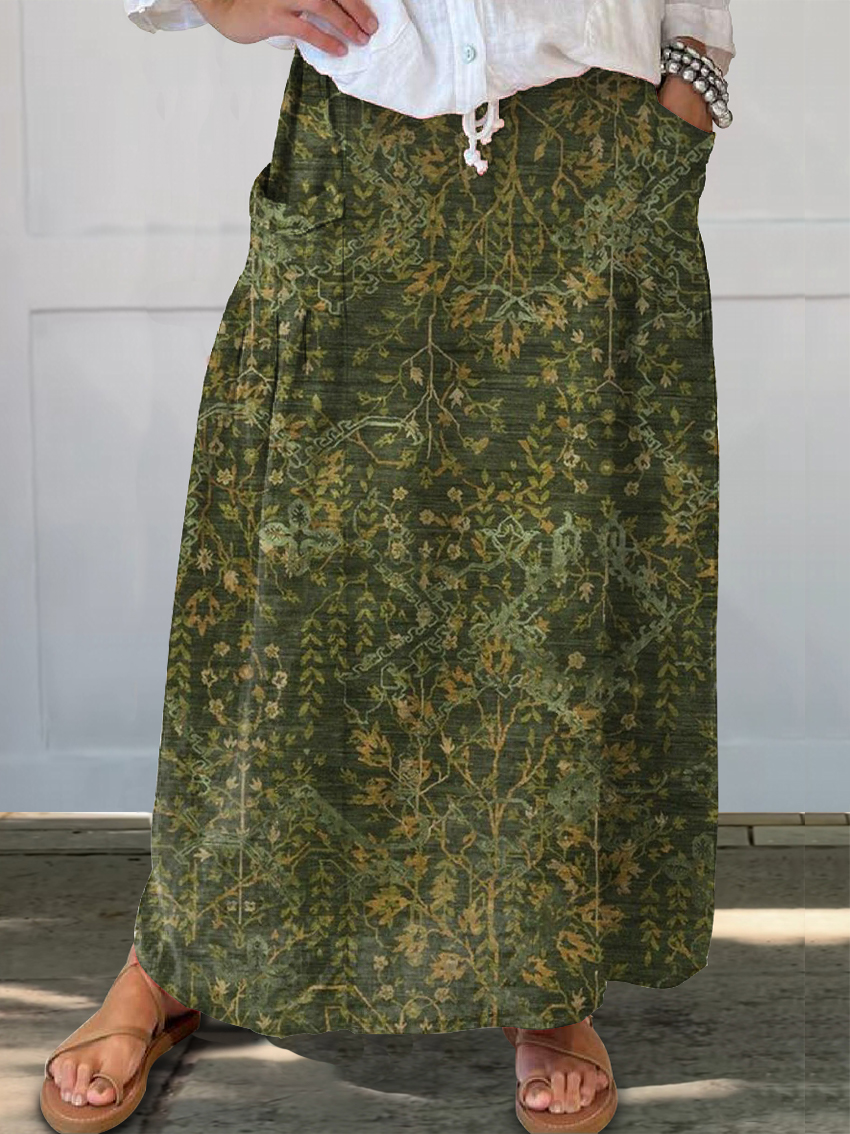 Women's Floral Textured Art Pattern Prints Linen Pocket Skirt