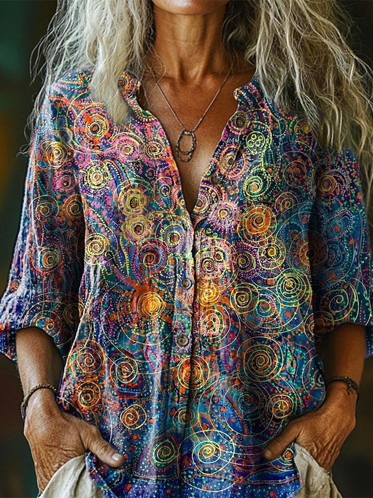 Colorful National Striped Arc Women's Print Casual Cotton Linen Shirt