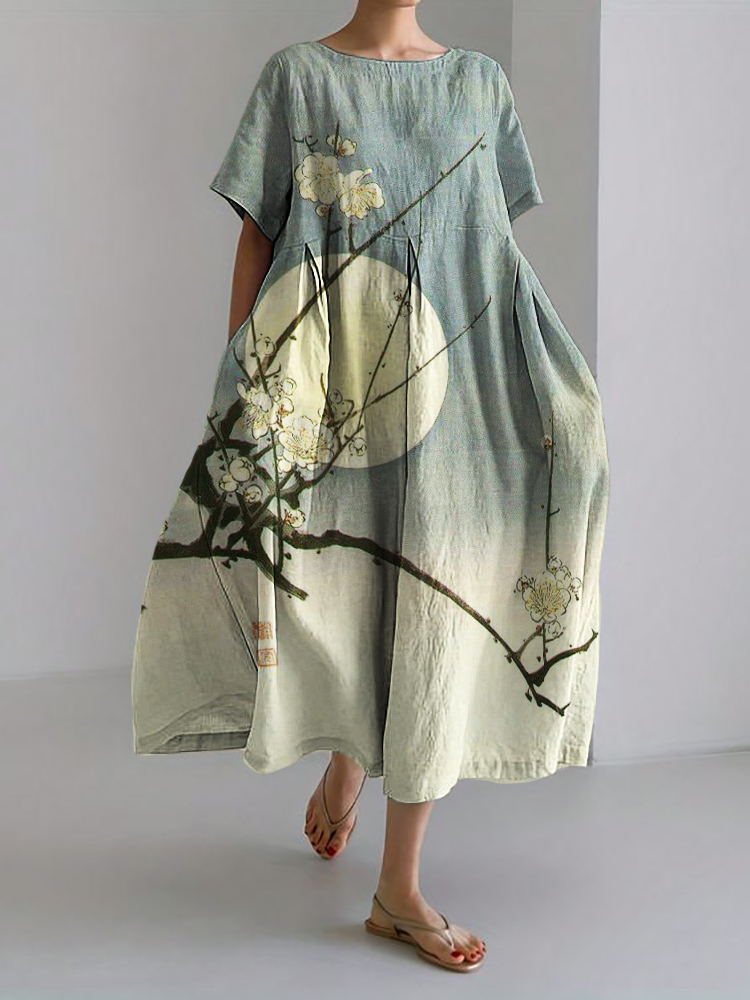 Plum Blossom Full Moon Gradient Japanese Art Linen Blend Maxi Dress