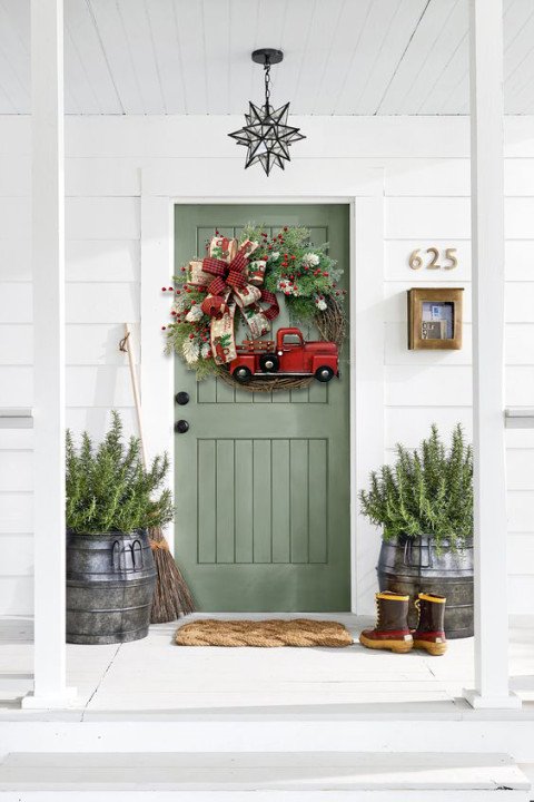 Vintage Red Truck Christmas Wreath made with junifer and flocked pine with green and red berries with 13″ metal red truck finished with black and red check and red truck bow. This is a perfect farmhouse wreath on your front door for christmas or hang it anywhere inside your house.