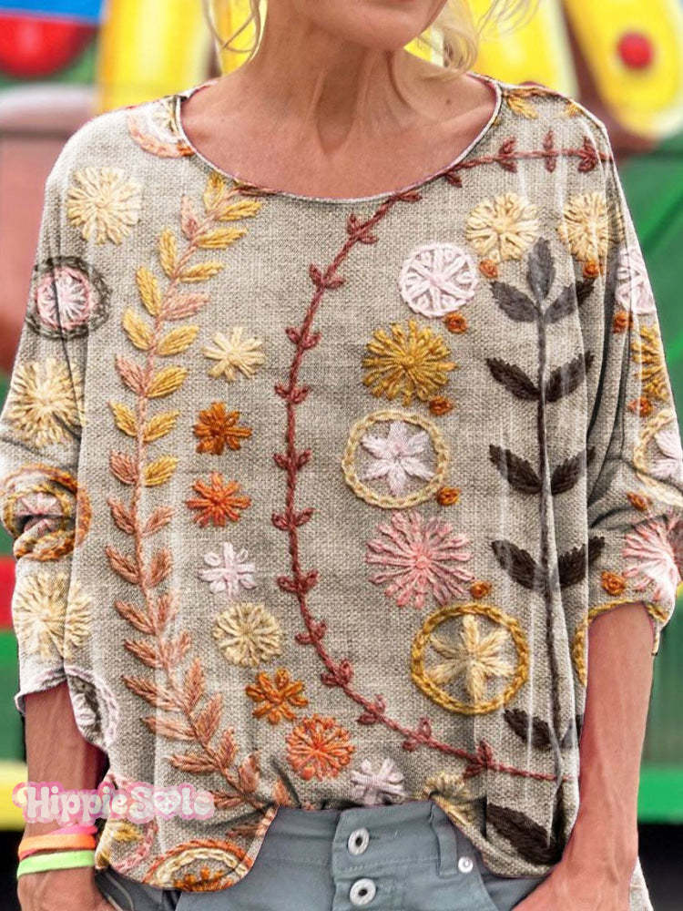 Vintage Embroidered Floral Totem Art Print Casual Long Sleeve T-shirt