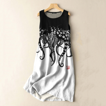 Vintage Japanese Art Octopus Legs Print Sleeveless Cotton And Linen Midi Dress