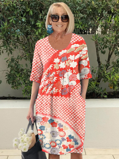 Vintage Japanese Floral Art Casual Pocket Dress