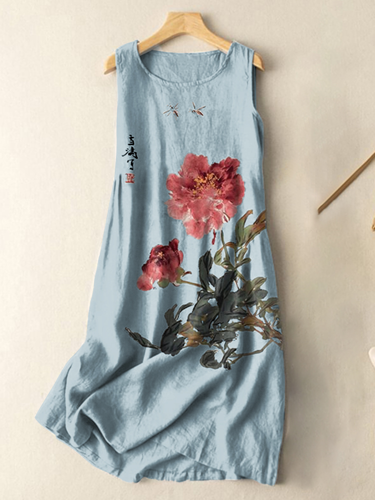 Vintage Japanese Ink Flower Calligraphy Art Print Sleeveless Cotton And Linen Midi Dress