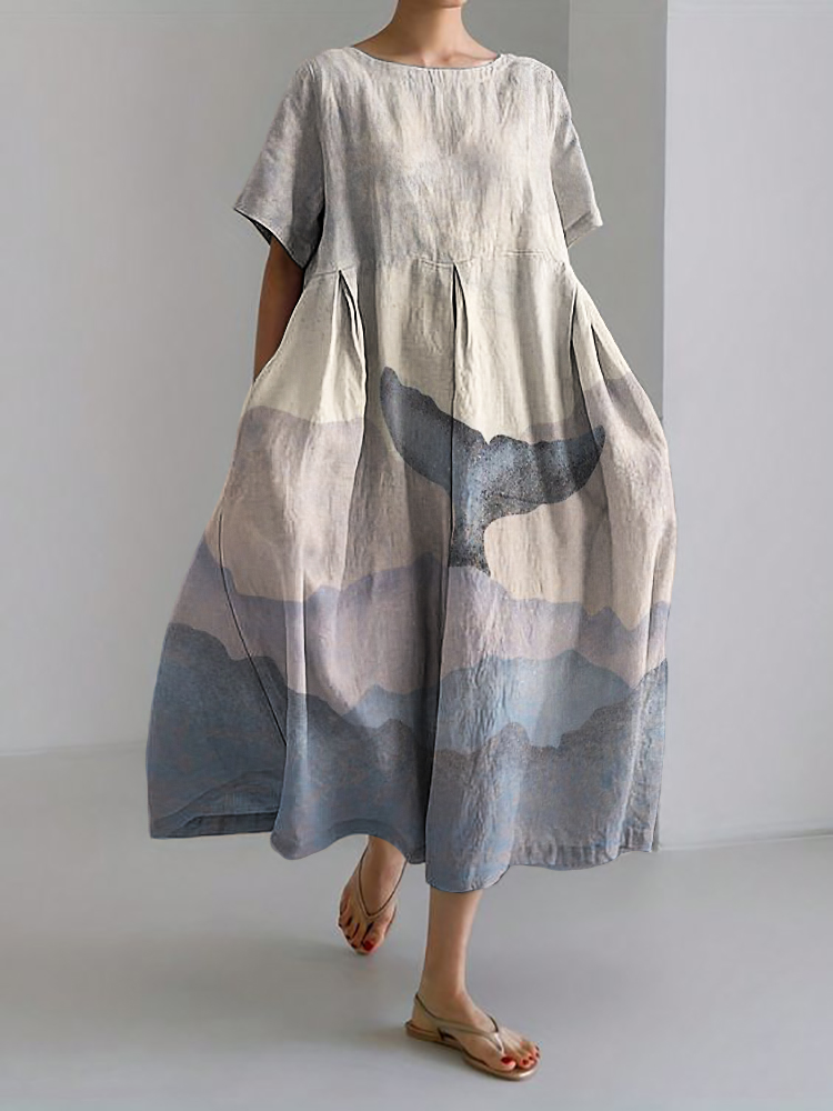 Whale Tail Sea Waves Colorblock Linen Blend Maxi Dress