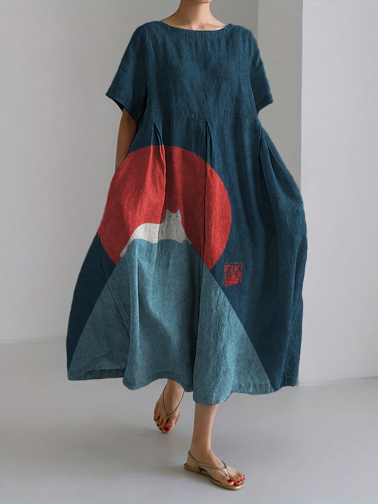 White Cat Snow on Mount Fuji Linen Blend Maxi Dress