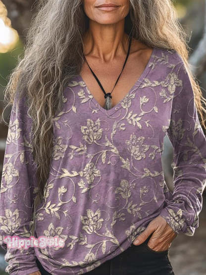 Women's Bohemian Flower Art Print Casual V-neck Long Sleeve Cotton T-shirt