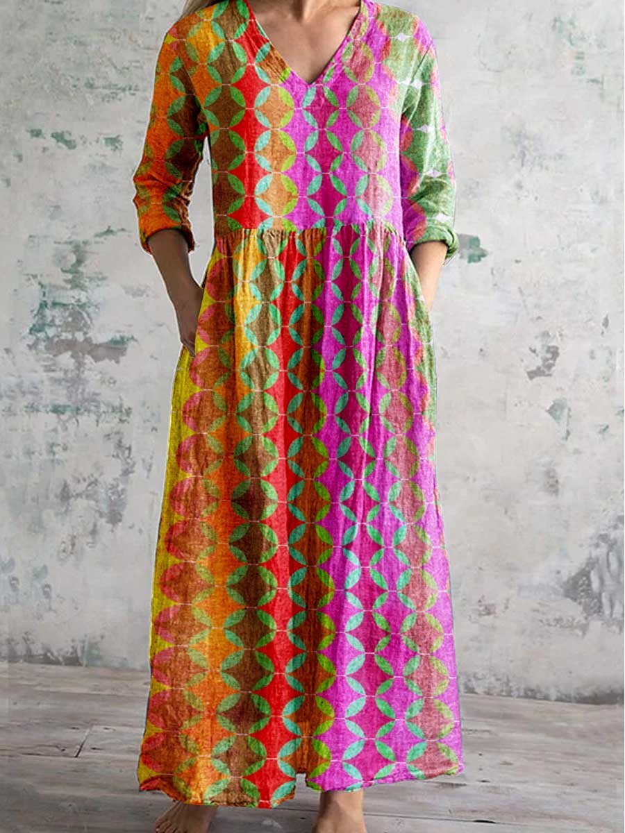 Women's Bohemian Split Geometric Pattern V Neck Cotton and Linen Dress With Pockets