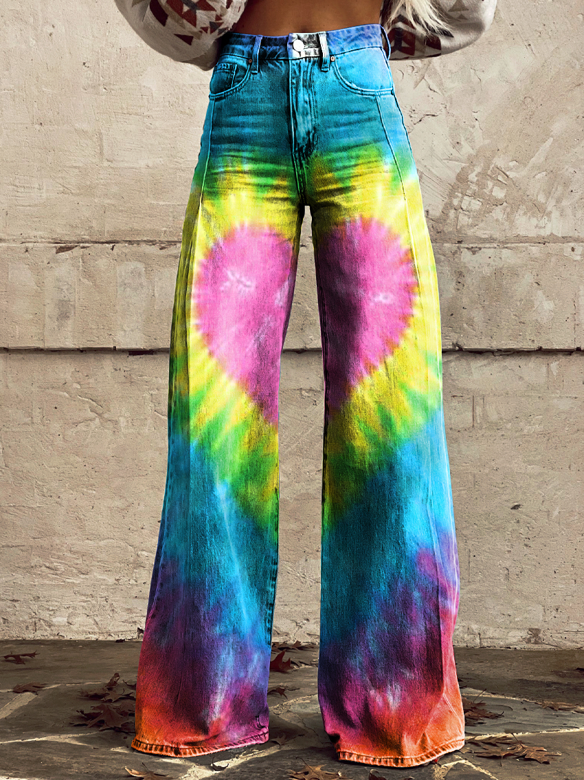 Women's Colorful love heart tie dye Print Casual Wide Leg Pants
