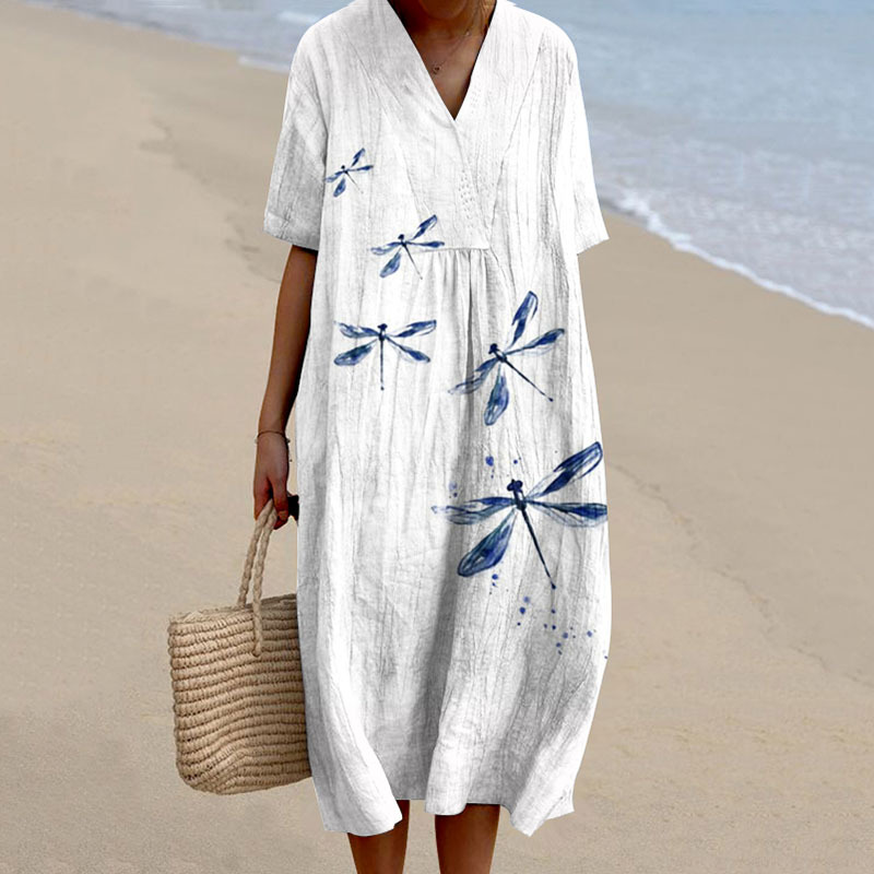 Women'S Dragonfly Print Linen Blend Dress