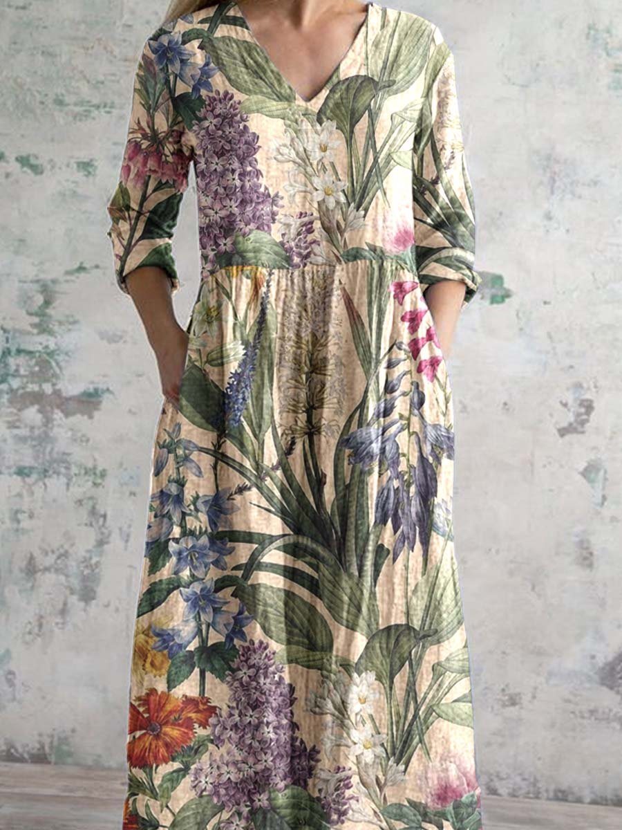 Women's Elegant V-Neck Floral Pattern Cotton and Linen Dress