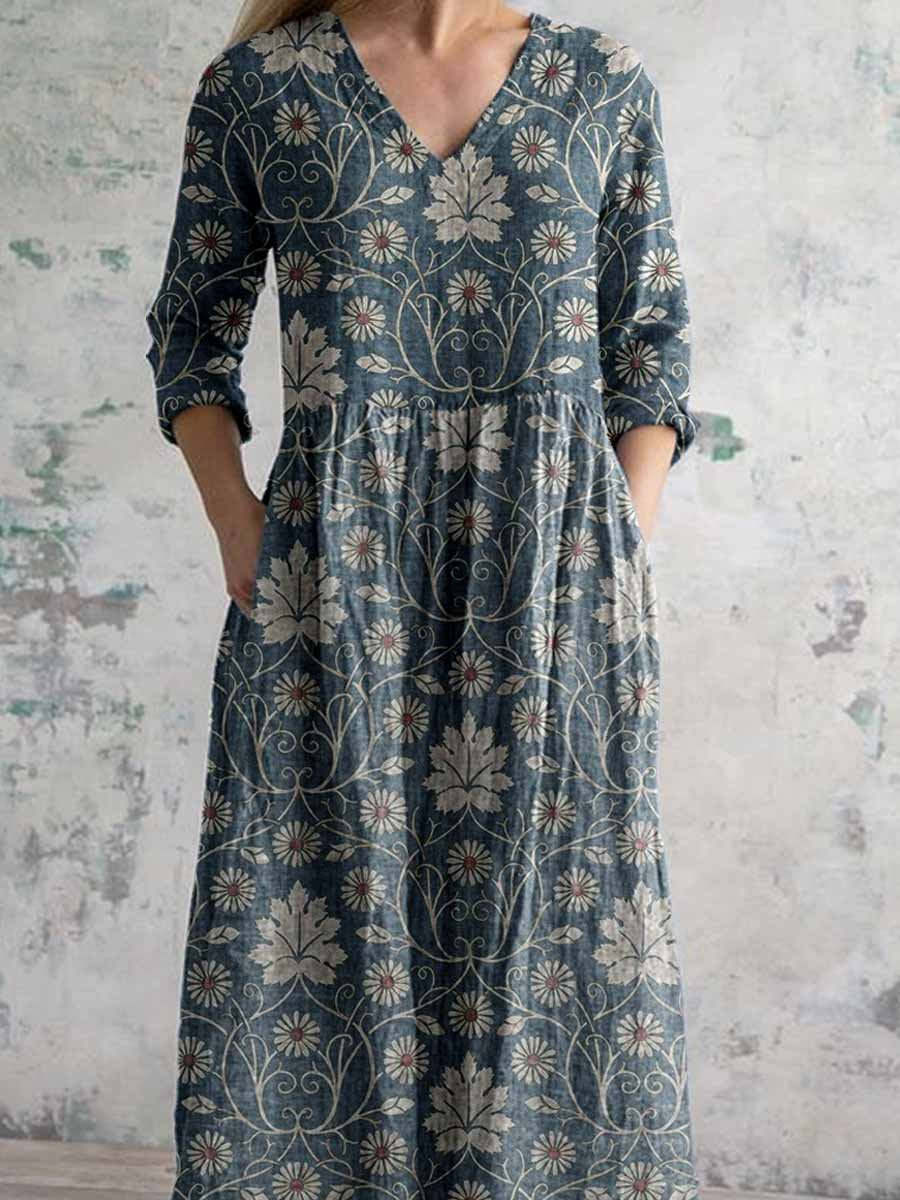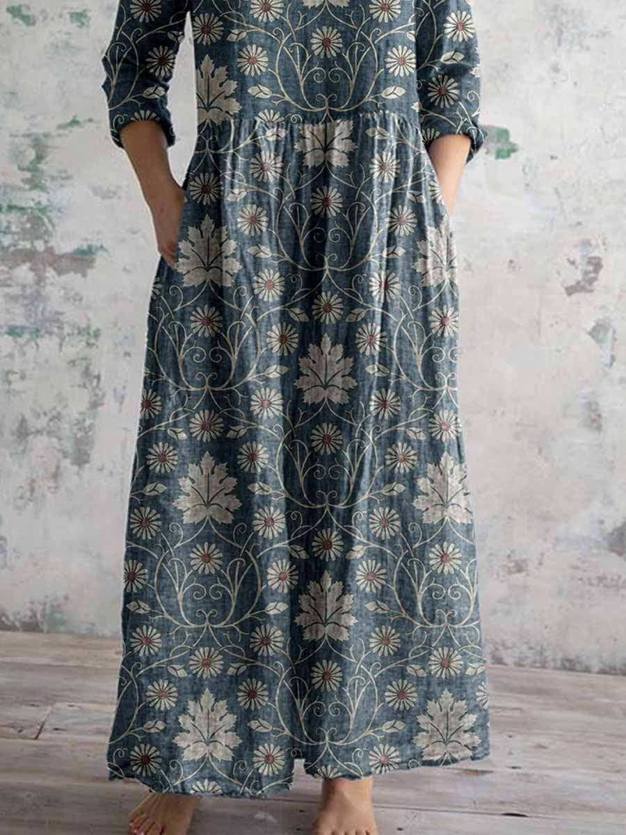 Women's Elegant Vintage Floral Pattern Cotton and Linen Dress with Pockets
