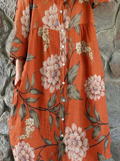 Women's Elegant Vintage Floral Print Shirt Style Cotton and Linen Dress