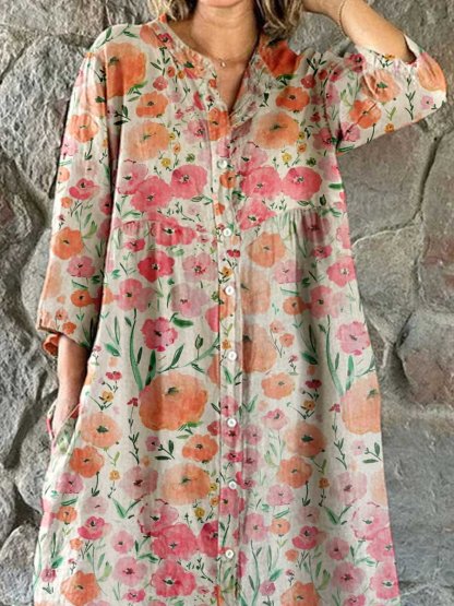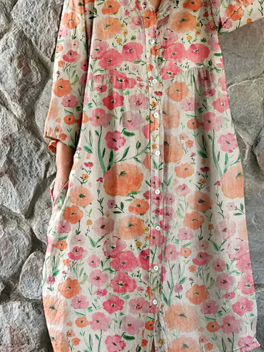 Women's Elegant Vintage Floral Print Shirt Style Cotton and Linen Dress