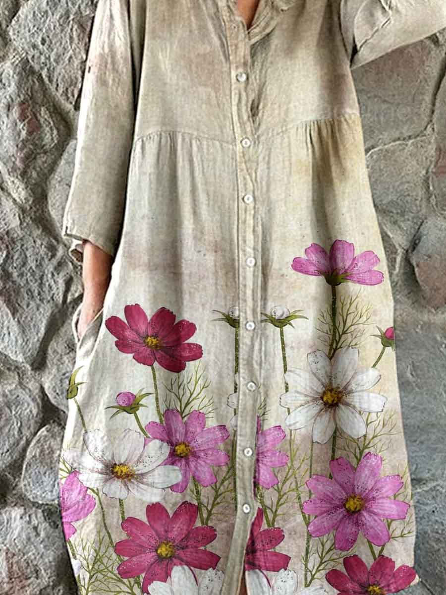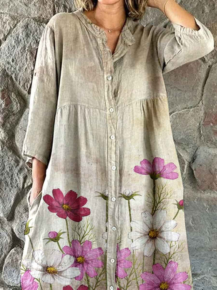 Women's Elegant Vintage Floral Print Shirt Style Cotton and Linen Dress