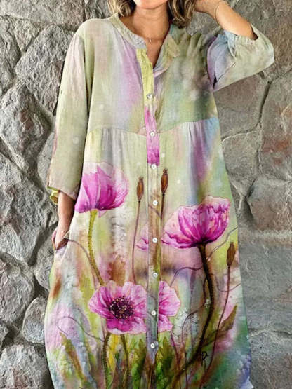 Women's Elegant Vintage Poppy Floral Shirt Style Cotton and Linen Dress