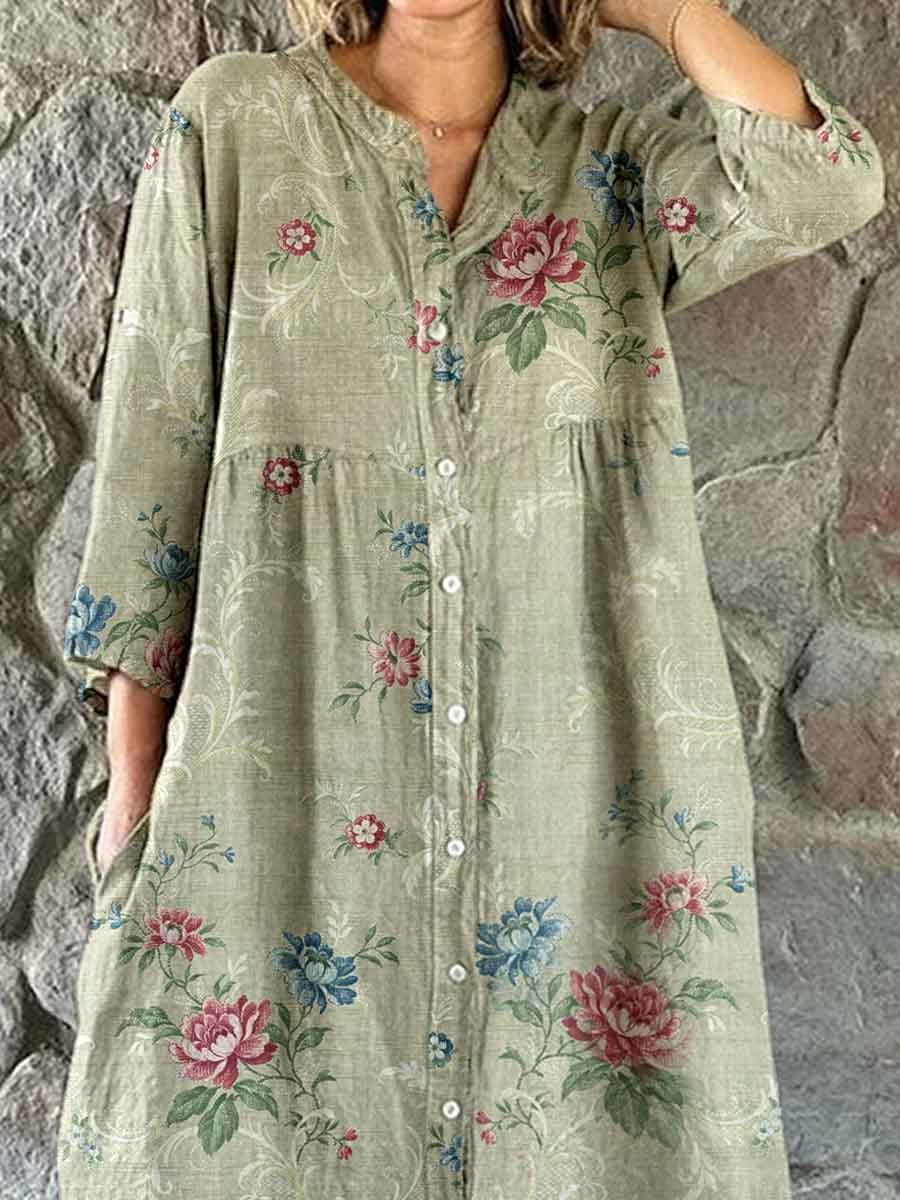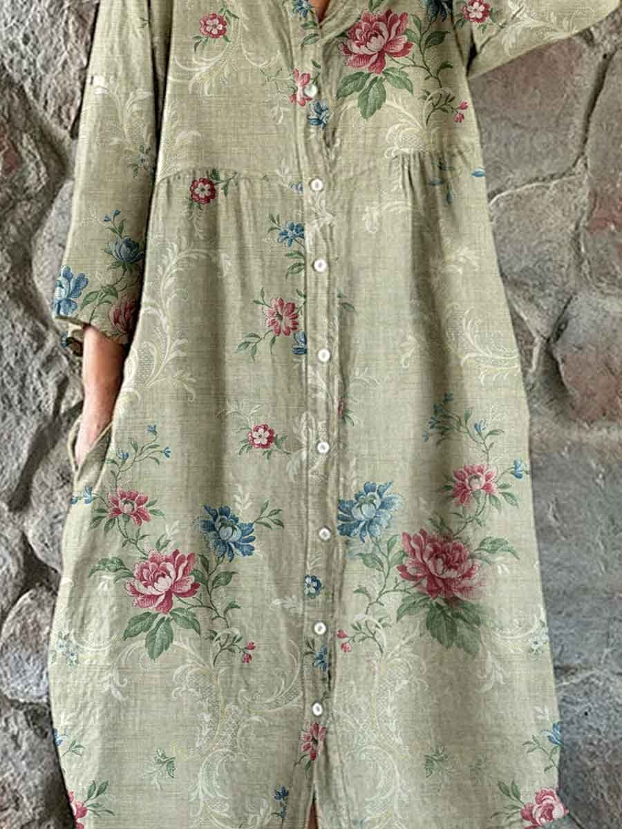 Women's Elegant Vintage Rose Floral Print Shirt Style Cotton and Linen Dress