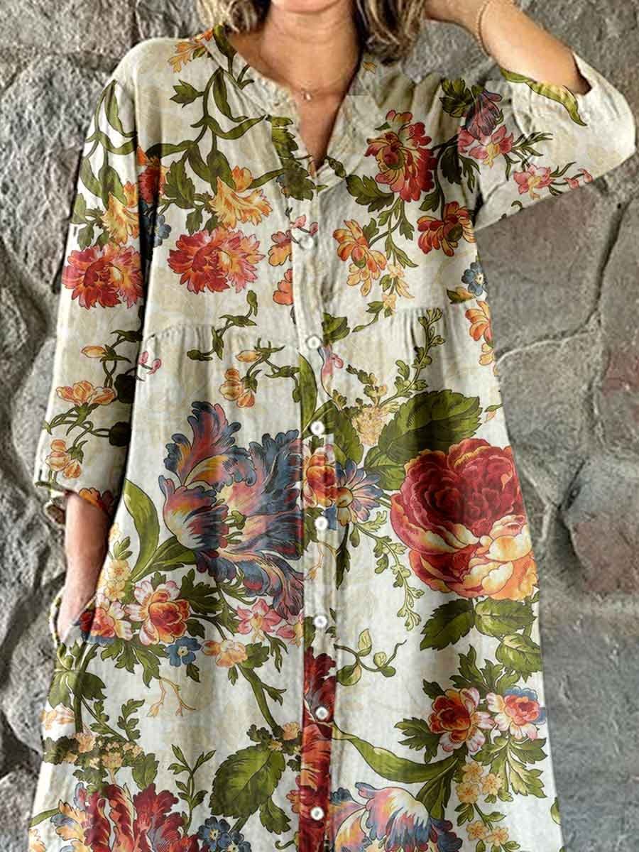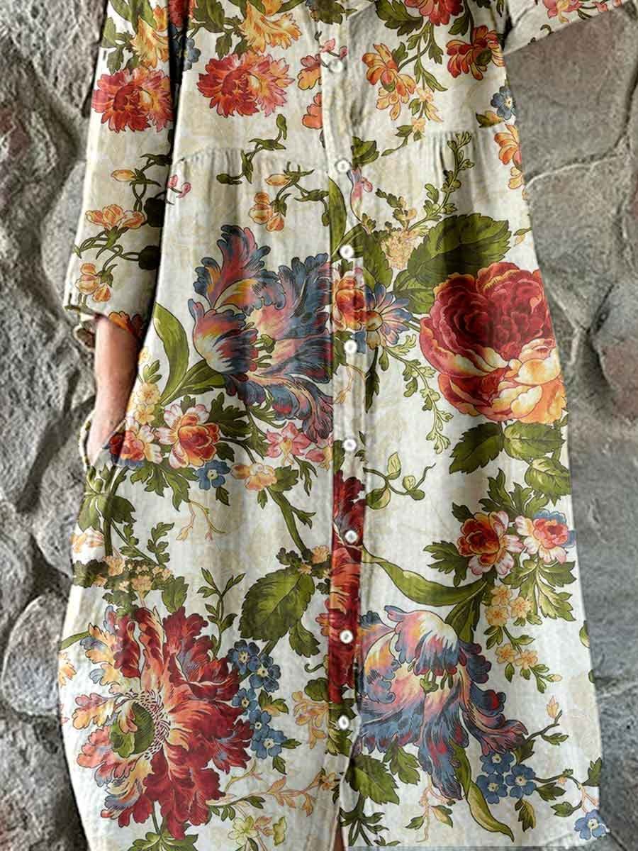 Women's Elegant Vintage Rose Floral Print Shirt Style Cotton and Linen Dress