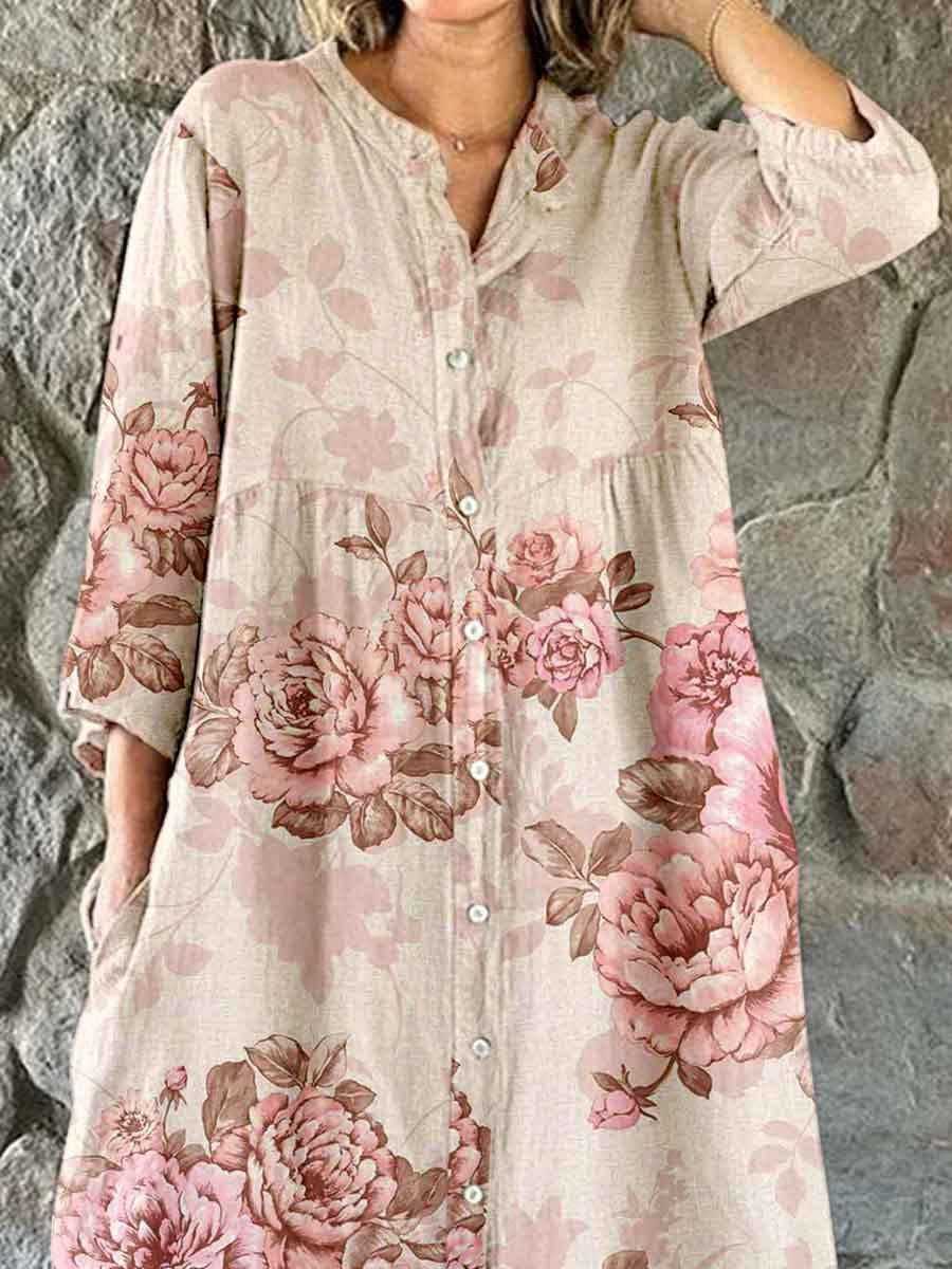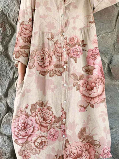 Women's Elegant Vintage Rose Floral Shirt Style Cotton and Linen Dress
