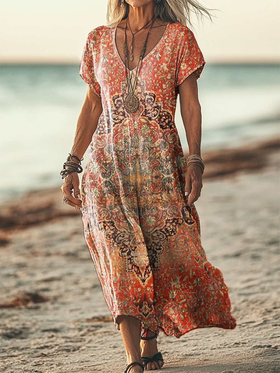 Women's Ethnic Floral Print Short Sleeve Pocket Cotton Linen Dress