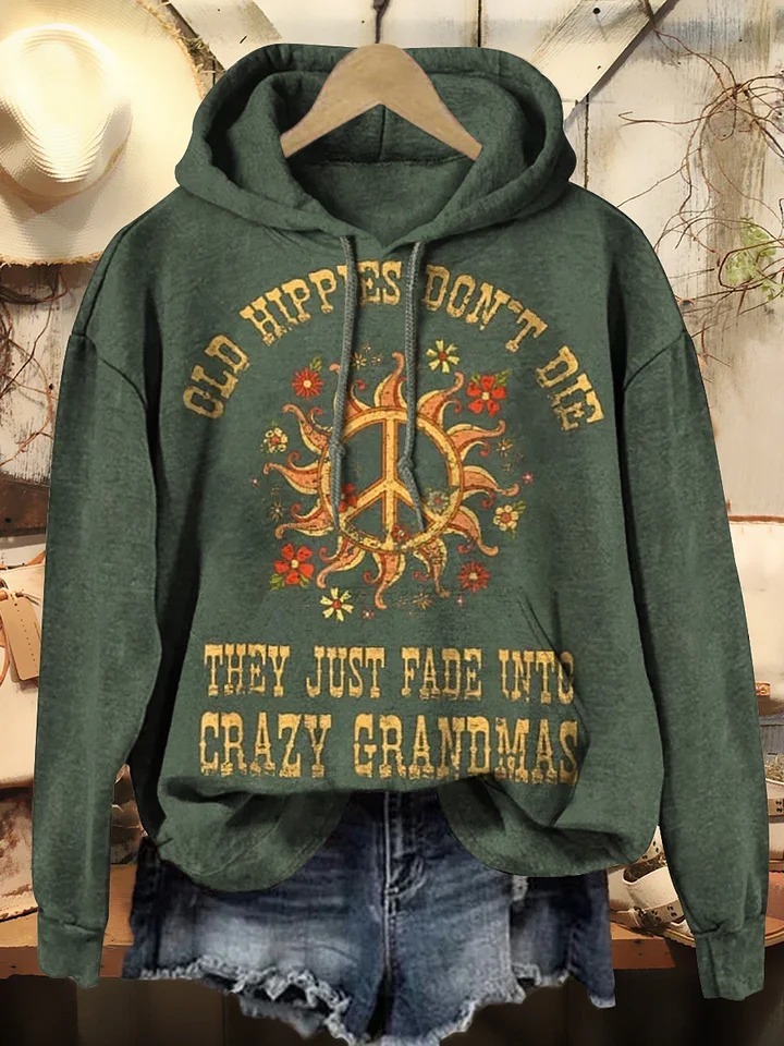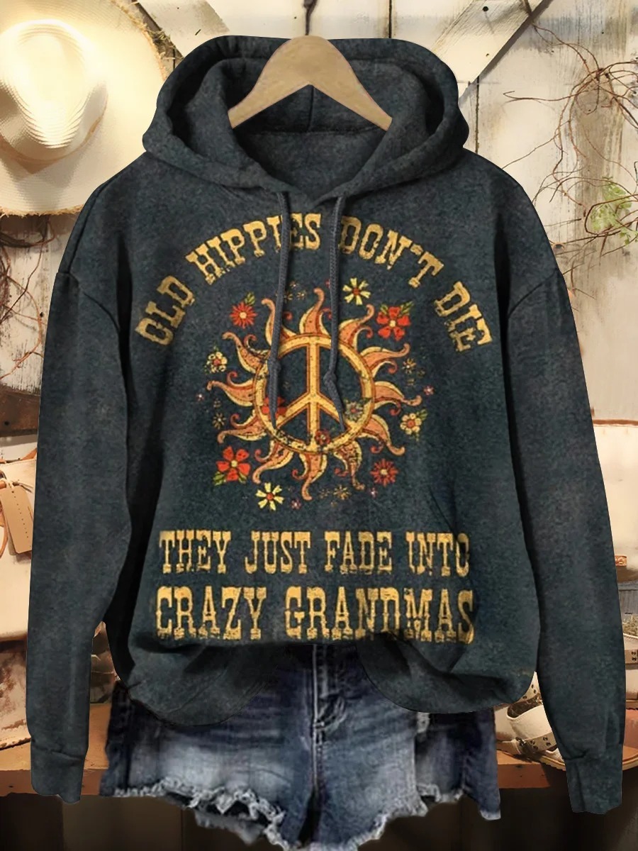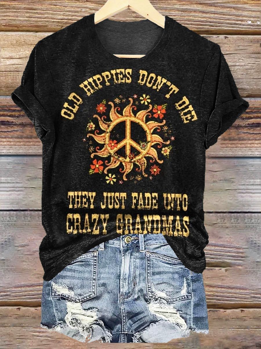 Women's Old Hippies Don't Die They Just Fade Into Crazy Grandmas Print Crew Neck T-shirt