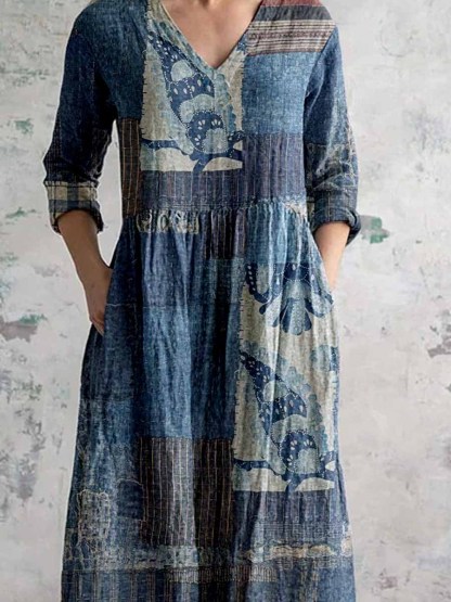 Women's Retro Geometric Pattern Cotton And Linen Dress