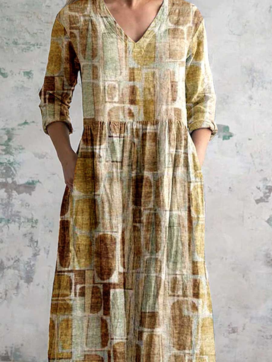 Women's Round Neck Vintage Geometric Print Pattern Dress with Pockets
