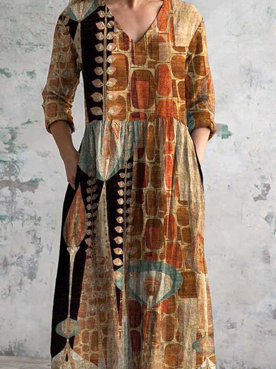 Women's Round Neck Vintage Geometric Print Pattern Dress with Pockets