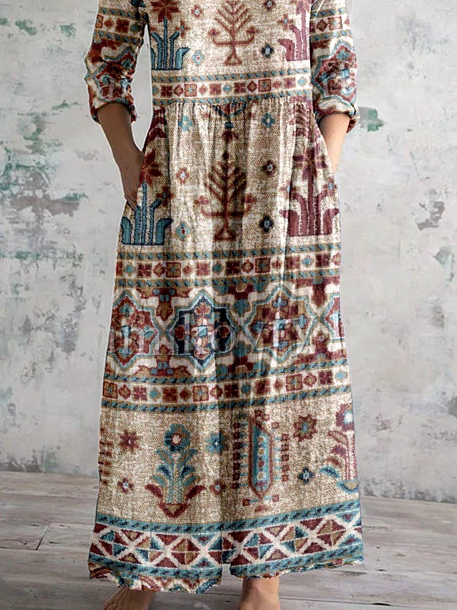 Women's V-Neck Vintage Geometric Floral Print Dress With Pockets