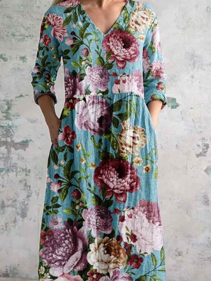 Women's V-neck Vintage Rose Floral Cotton and Linen Dress With Pockets