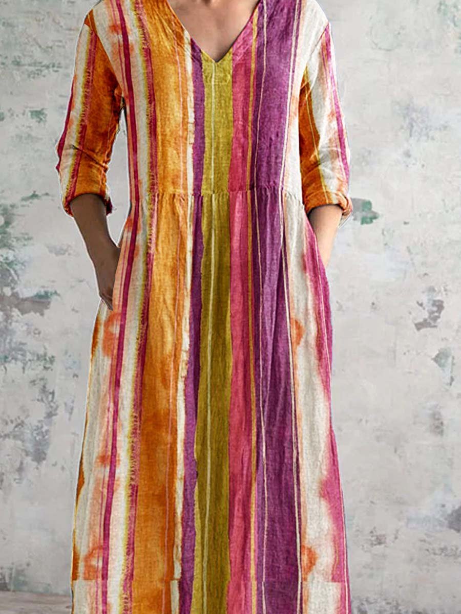 Women's Vintage Boho Stripe Pattern V Neck Dress with Pockets