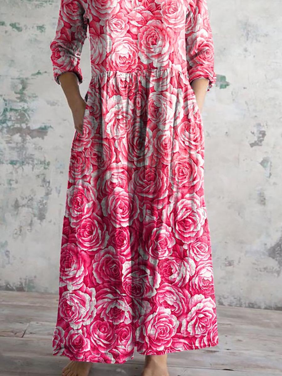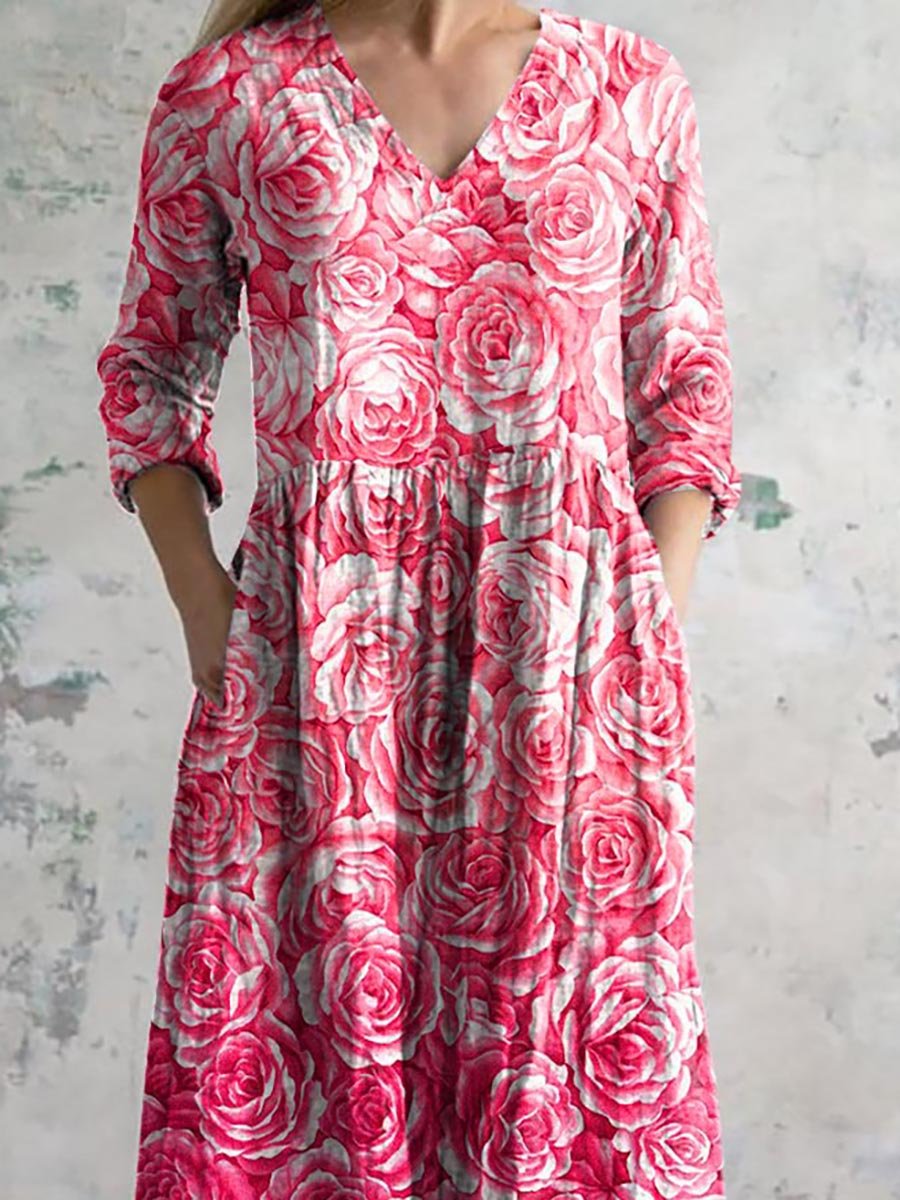 Women's Vintage Floral Art Pattern Printed Casual Cotton Dress