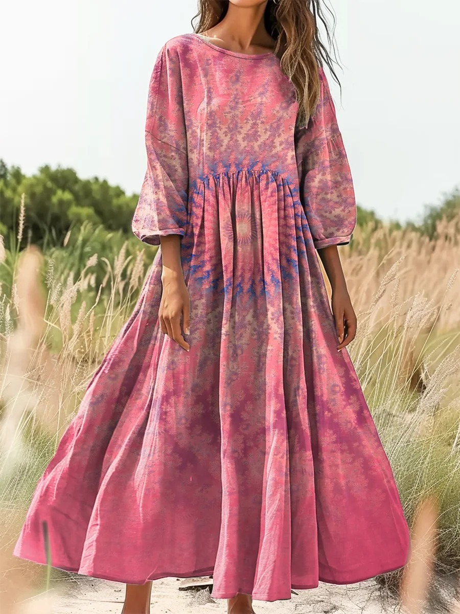 Women's Vintage Folk Art Floral Pattern Print Pocket Cotton Dress