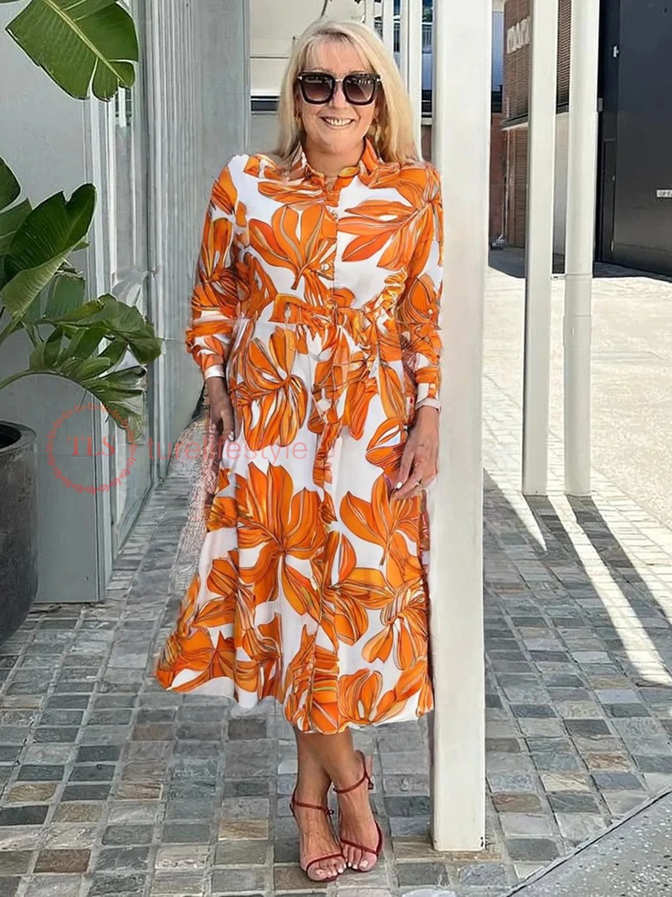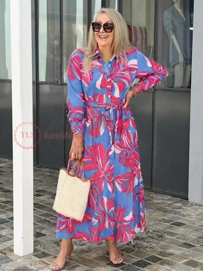 Women's Shirt Dress Casual Dress A Line Dress Stylish Casual Floral Maxi Dress Long Sleeve Shirt Collar Tie Front Buttons Print Regular Fit Vacation Daily Blue Orange Spring Fall